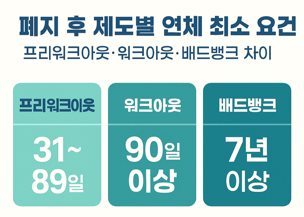 폐지 후 제도별 연체 최소 요건: 프리워크아웃·워크아웃·배드뱅크 차이
